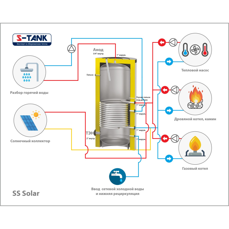 Бак предназначен для аккумулирования горячей воды от различных источников. Бак S-TANK серии SOLAR SS улучшает гибкость системы ГВС, позволяя Вам аккумулировать постоянный объем горячей воды. А возможность подключения электрического нагревателя в отверстие с внутренней резьбой 1 1/2'', делает бак более универсальным.