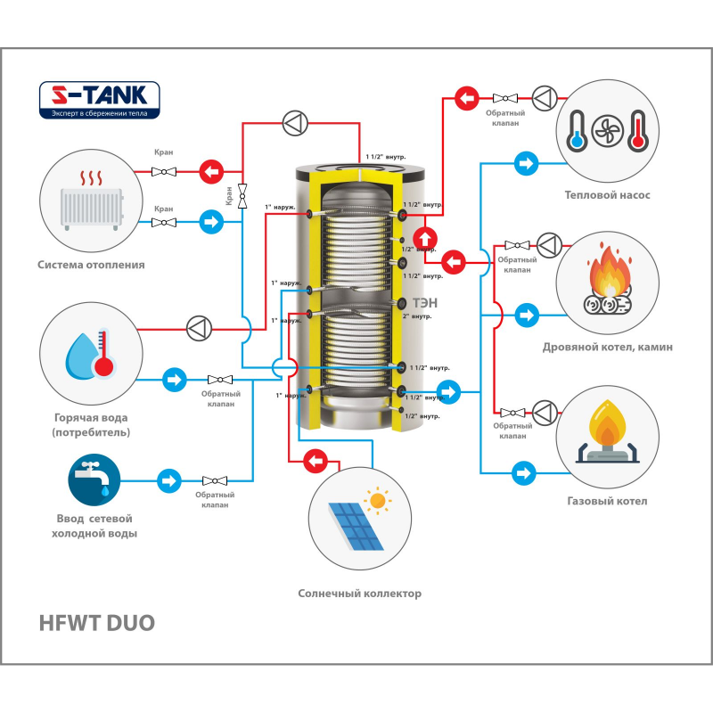 Идеален для комбинированных систем отопления: твердотопливный котёл, тепловой насос, солнечный коллектор, электрический котёл — всё это можно подключить к HFWT DUO 1000, используя оба змеевика.