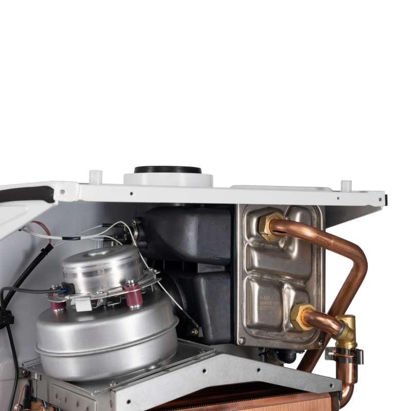 Надёжная конструкция: медный теплообменник, закрытая камера сгорания, модуляция — долговечность и эффективность.