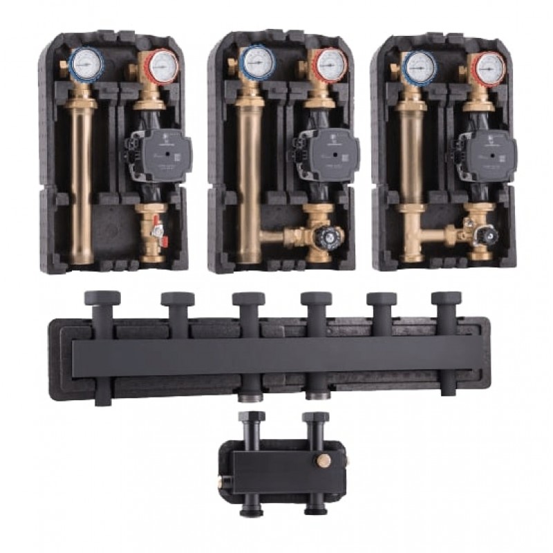 Распределительный коллектор разрабатывался специально для насосных групп Barberi. Корпус коллектора защищен теплоизоляцией. В комплекте так же идут крепежные кронштейны и поворотные накидные гайки.