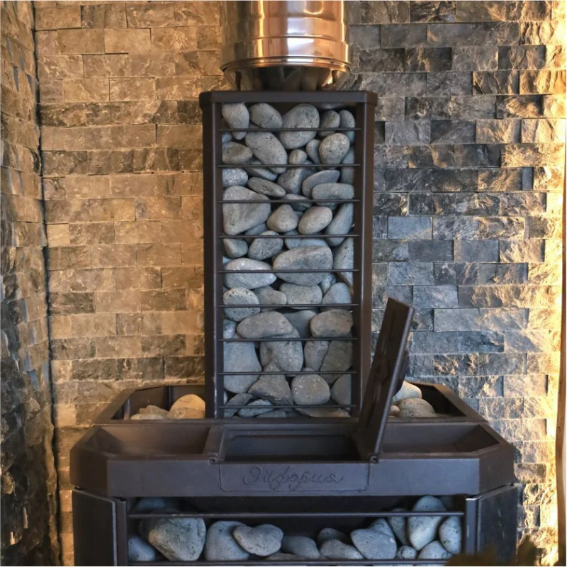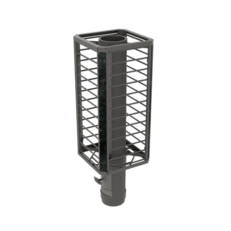 Сетка-каменка обеспечивает равномерный прогрев камней и формирует мягкий, насыщенный пар, улучшая микроклимат в парной. Натрубная конструкция упрощает установку и загрузку камней прямо на топку, экономя место и повышая удобство использования.