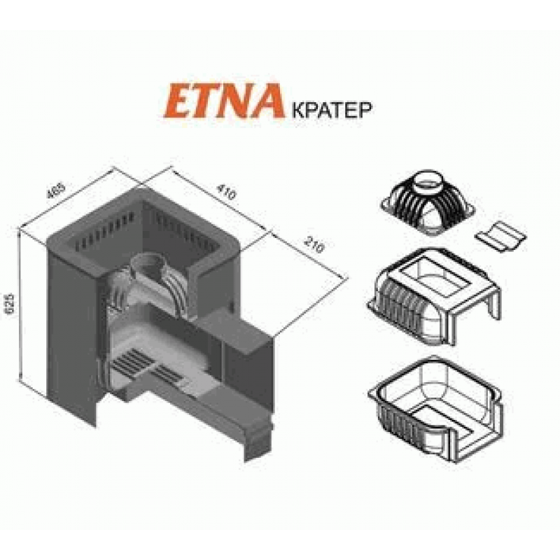 Топка печи ЭТНА Кратер выполнена из трех элементов с болтовым соединением и керамическим шнуром между элементами. Банные чугунные печи «ЭТНА» обладают высокой тепловой мощностью и длительным сроком службы.