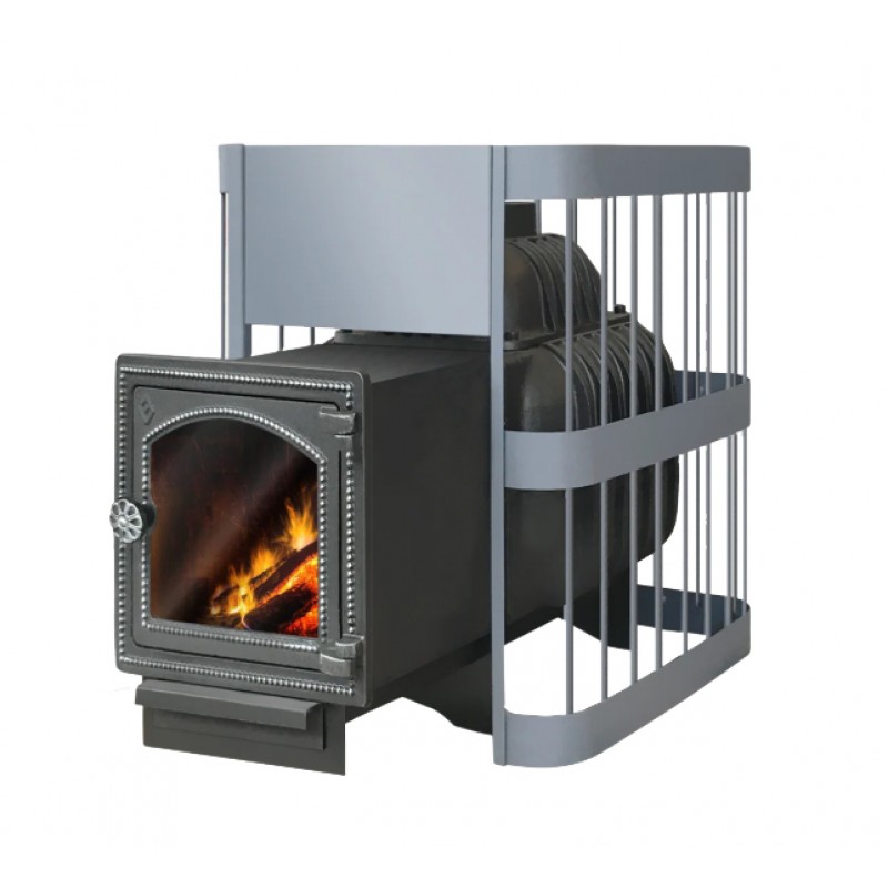 Банная чугунная печь ЭТНА Магма 18 ДТ-4C - печь для парной с объемом от 12 до 18 м.куб. укомплектована топочной глухой чугунной дверцей и конвекционно-вентилируемым кожухом изготовленным из калиброванного прута с большой загрузкой камней. Выносная топка позволяет протапливать печь из соседнего с парной помещения. Большая масса камней позволяет надолго сохранять тепло после угасания огня.