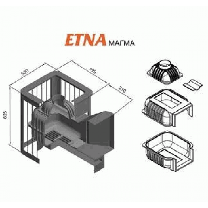 Топка печи ЭТНА Магма выполнена из трех элементов с болтовым соединением и керамическим шнуром между элементами. Банные чугунные печи «ЭТНА» обладают высокой тепловой мощностью и длительным сроком службы.