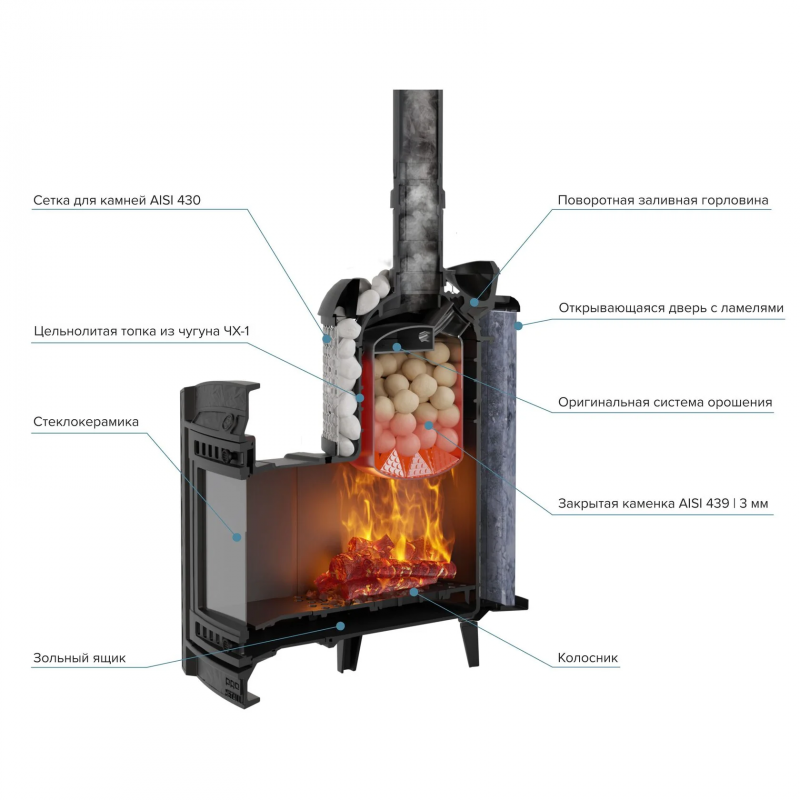 Увеличенная теплоёмкость — ламели из талькохлорита отлично аккумулируют тепло, благодаря чему печь долго отдаёт тепло после разогрева.