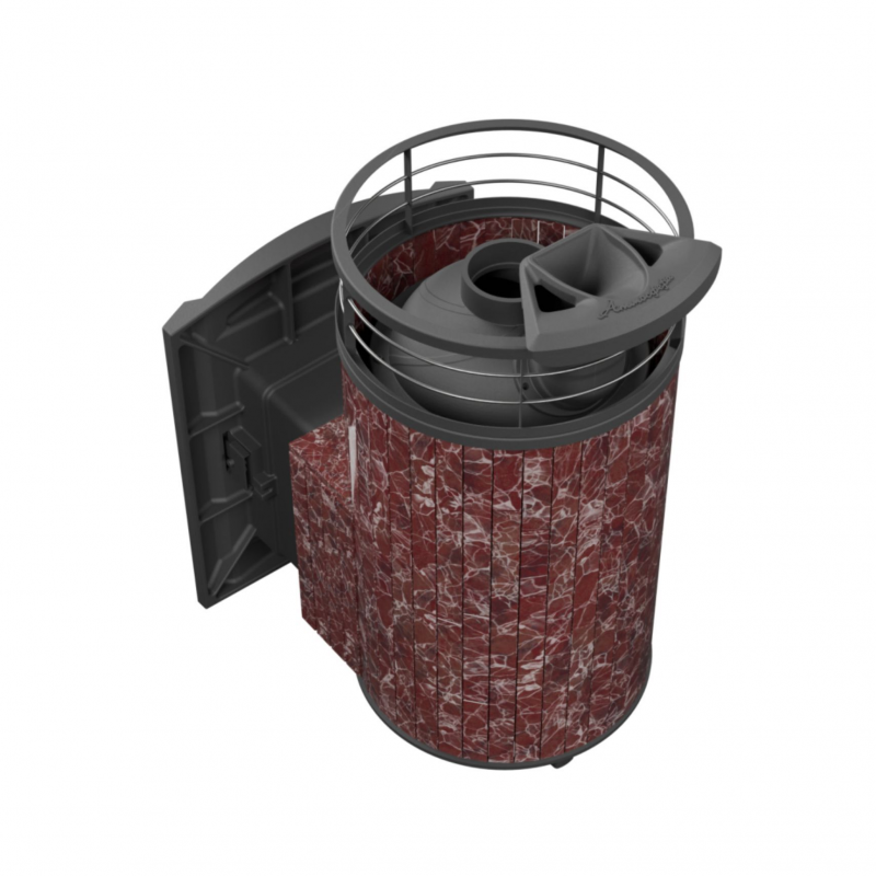 Печь для бани ProMetall «Атмосфера L» с комбинированной облицовкой Россо Леванто (ламель + сетка) и тоннелем — практичная и компактная модель. Ламели по периметру внешней каменки не только обладают хорошими теплонакопительными свойствами, но и придают печи оригинальный внешний вид