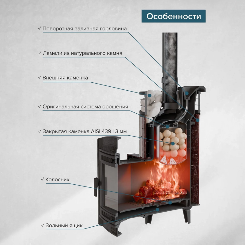 Долговечность и надёжность — чугун и нержавеющая каменка рассчитаны на долгую эксплуатацию.