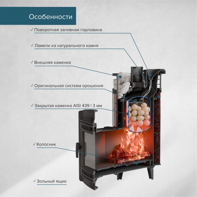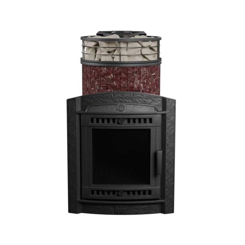 Эстетическая ценность: сочетание натурального камня и металла делает печь частью интерьера и важным декоративным элементом парной.