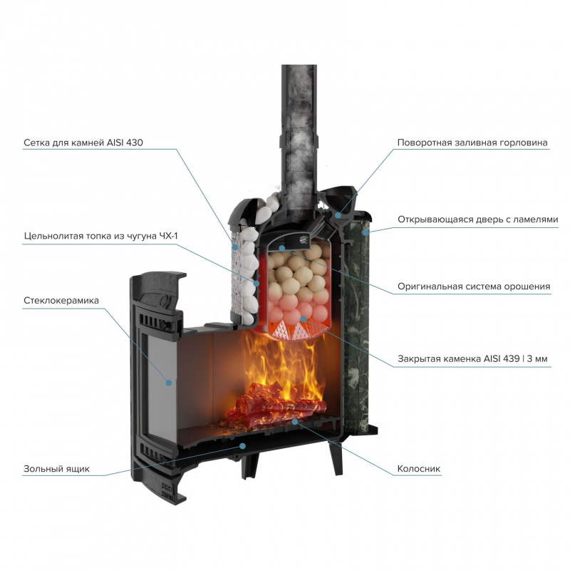 Долговечность и надёжность — чугун и нержавеющая каменка рассчитаны на долгую эксплуатацию.