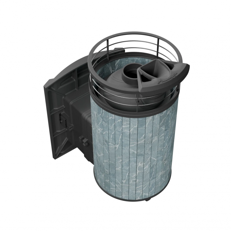 Печь для бани ProMetall «Атмосфера L» с комбинированной облицовкой Талькохлорит (ламель + сетка) — практичная и компактная модель. Ламели из змеевика по периметру внешней каменки не только обладают хорошими теплонакопительными свойствами, но и придают печи оригинальный внешний вид