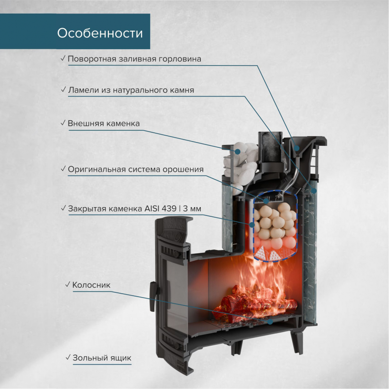 Высокая долговечность — чугунный корпус и нержавеющая каменка выдерживают многолетние нагрузки.