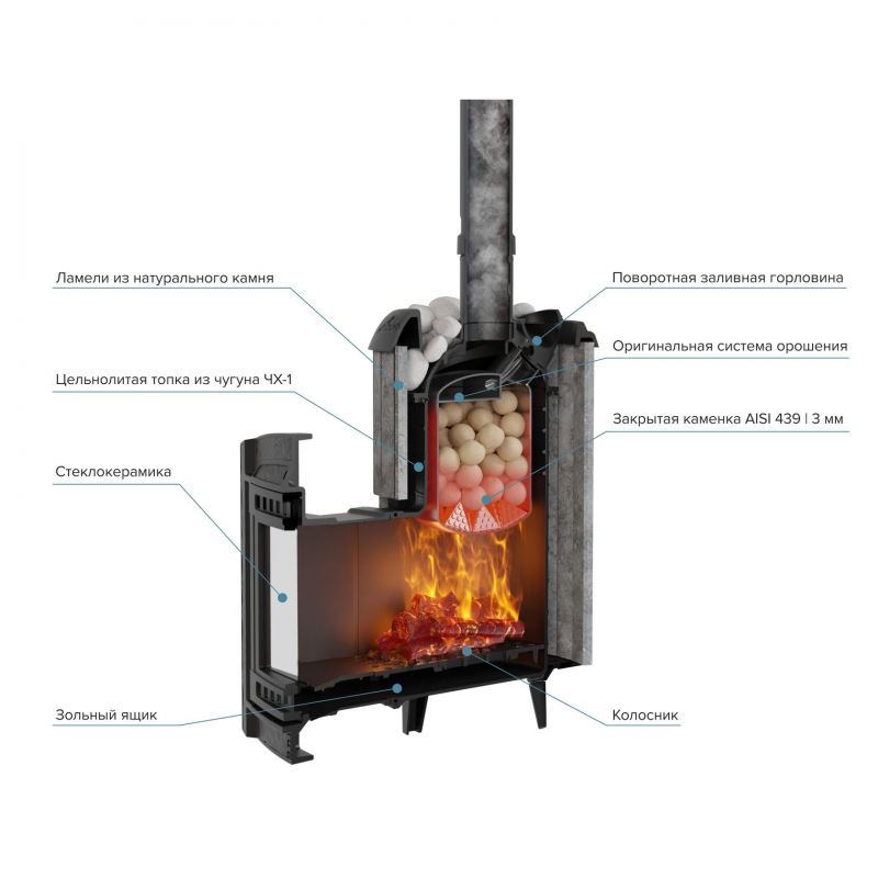 Теплоаккумуляция и устойчивость: талькохлорит — натуральный минерал, обладающий отличной теплоёмкостью — он хорошо накапливает тепло и отдаёт его постепенно, обеспечивая длительный прогрев.