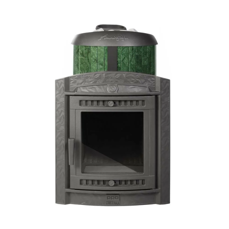 Чугунная банная печь ProMetall «Атмосфера L» в ламелях Верде Гватемала — практичная и компактная модель. Ламели по периметру внешней каменки не только обладают хорошими теплонакопительными свойствами, но и придают печи оригинальный внешний вид