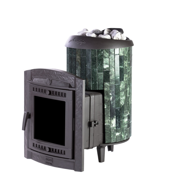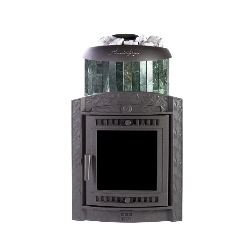 Чугунная банная печь ProMetall «Атмосфера L» в ламелях из змеевика — практичная и компактная модель. Ламели из змеевика по периметру внешней каменки не только обладают хорошими теплонакопительными свойствами, но и придают печи оригинальный внешний вид
