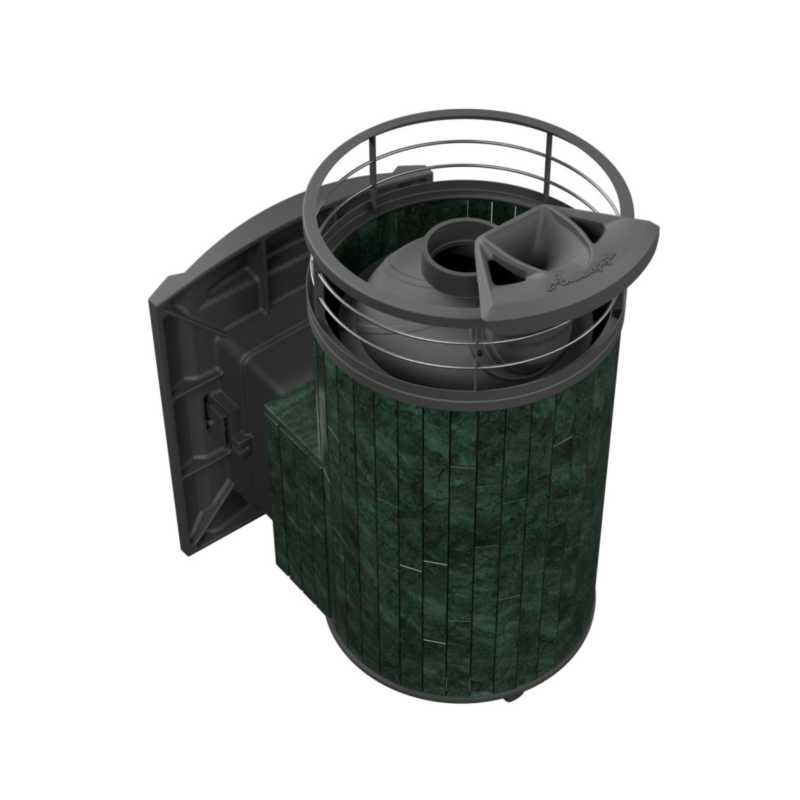 Печь для бани ProMetall «Атмосфера L» с комбинированной облицовкой Верде Гватемала (ламель + сетка) и тоннелем — практичная и компактная модель. Ламели по периметру внешней каменки не только обладают хорошими теплонакопительными свойствами, но и придают печи оригинальный внешний вид