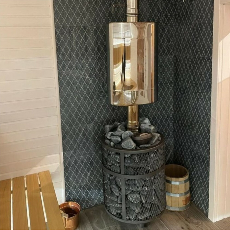 Мягкий, качественный пар: благодаря сочетанию внутренней каменки и большого объёма внешней сетки с камнями, пар получается плотный, насыщенный и с хорошей влажностью.