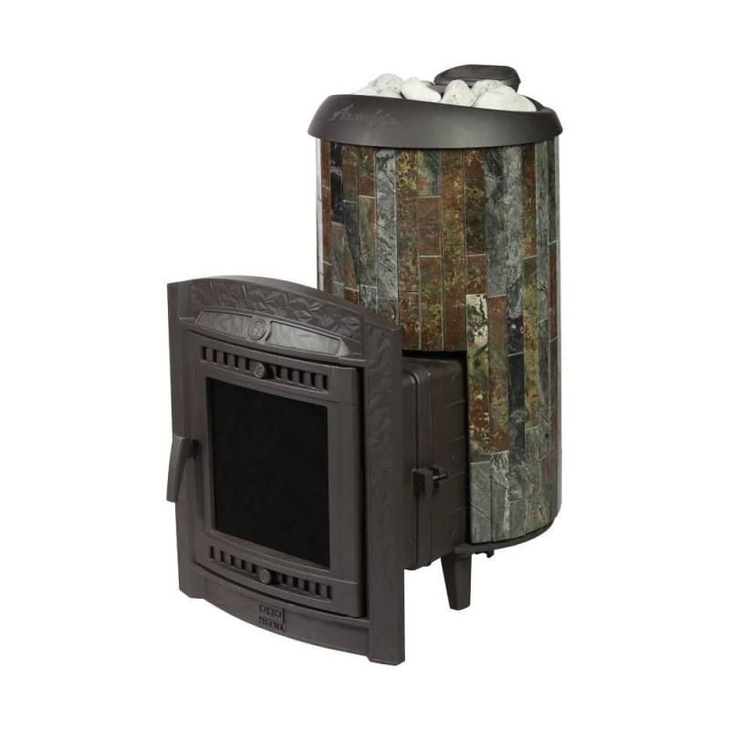 Натуральный жадеит: ламели из натурального камня не только эстетичны, но и отлично аккумулируют тепло, благодаря чему печь долго отдаёт тепло после прогрева.