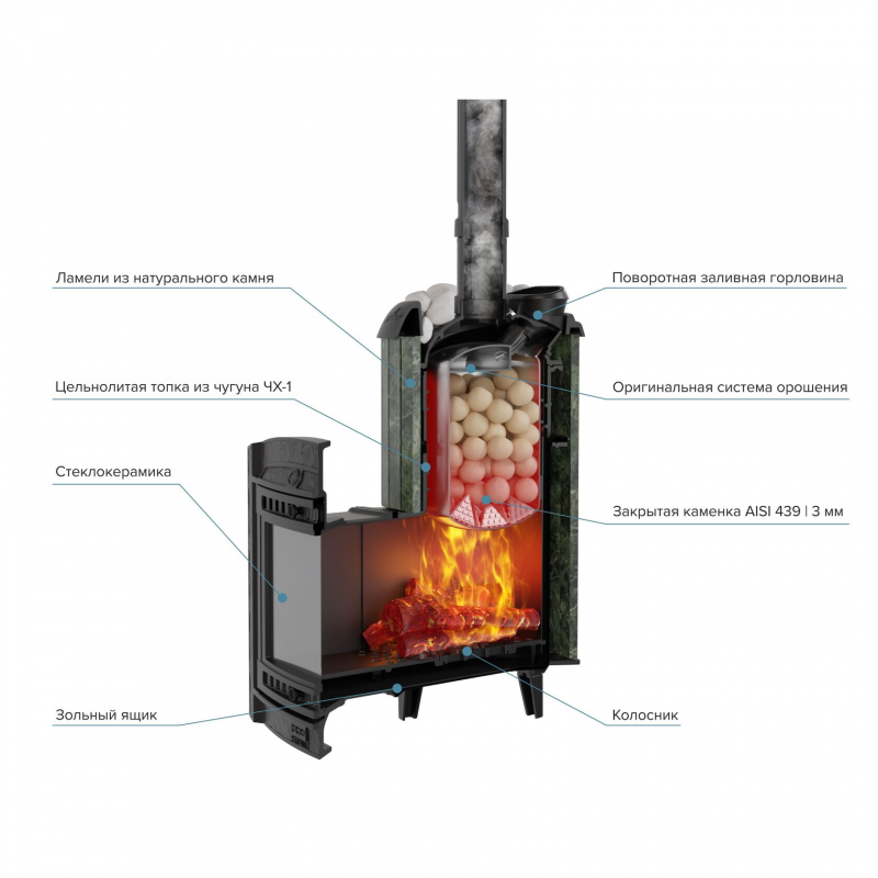 Качественный пар: благодаря внутренней каменке из нержавеющей стали + паровой пушке можно получить мелкодисперсный, насыщенный пар.
