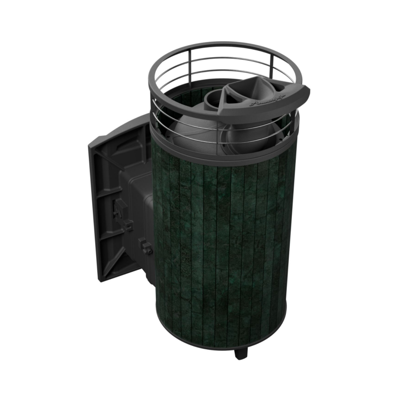 Эстетика природного камня: ламели “Верде Гватемала” придают печи природный зелёный/мраморный оттенок, что делает её визуально привлекательной и органичной в банном интерьере.