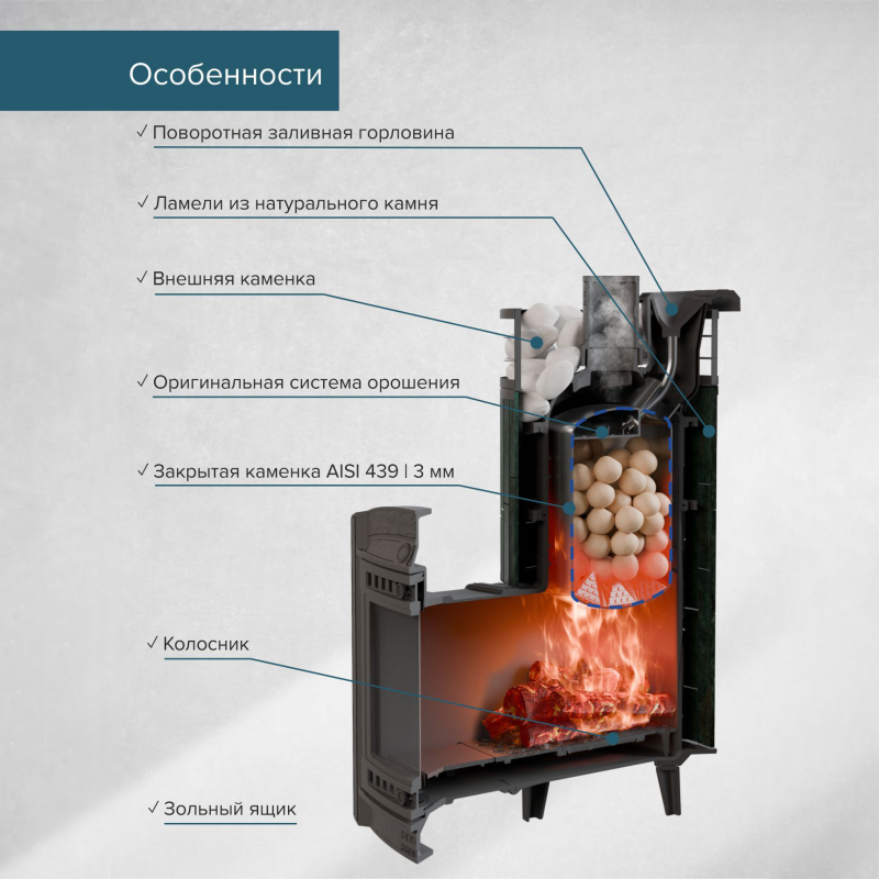 Высокая теплоаккумуляция: натуральный камень хорошо накапливает тепло, а сочетание с сеткой позволяет быстро отдавать тепло при парообразовании.