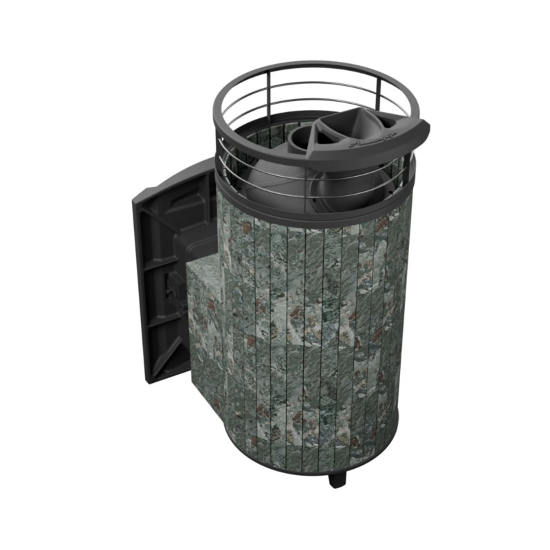 Печь для бани ProMetall «Атмосфера XL» с комбинированной облицовкой Жадеит (ламель + сетка) и тоннелем — модель с увеличенной каменкой и повышенной производительностью. Ламели по периметру внешней каменки не только обладают хорошими теплонакопительными свойствами, но и придают печи оригинальный внешний вид