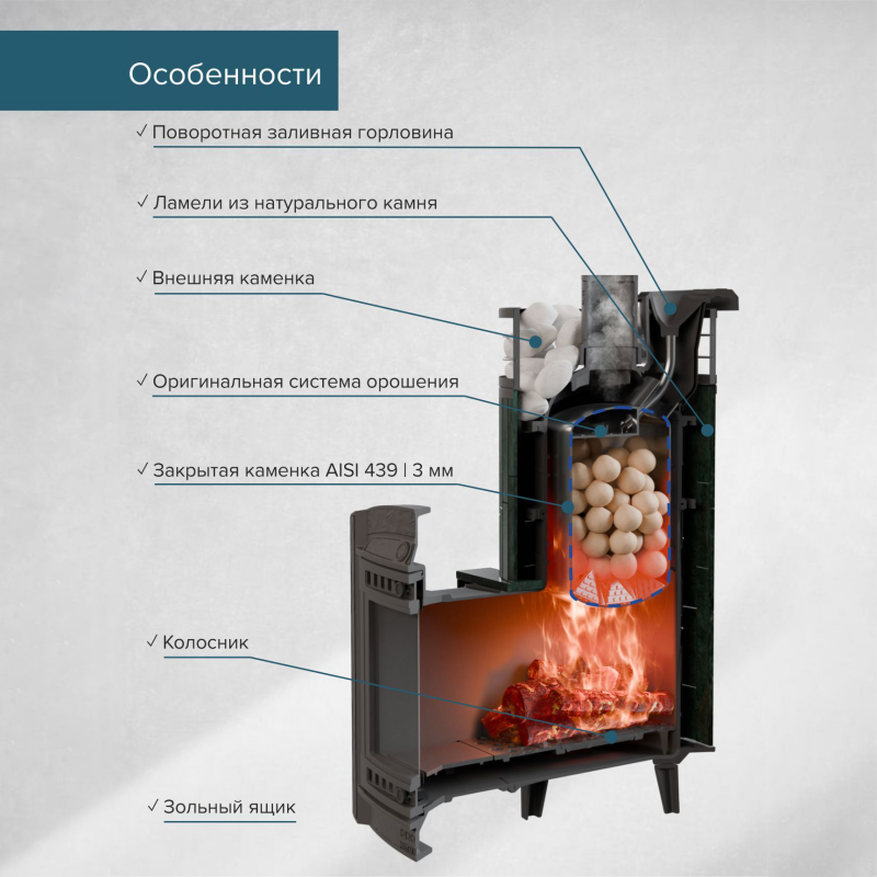 Долговечность и надёжность — чугун и нержавеющая каменка рассчитаны на долгую эксплуатацию.
