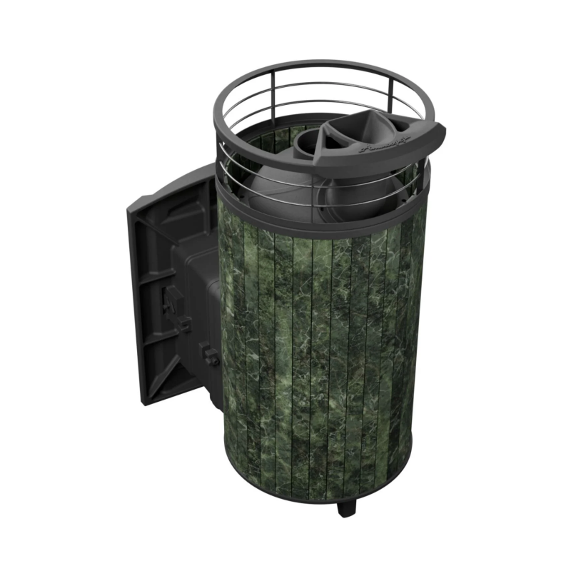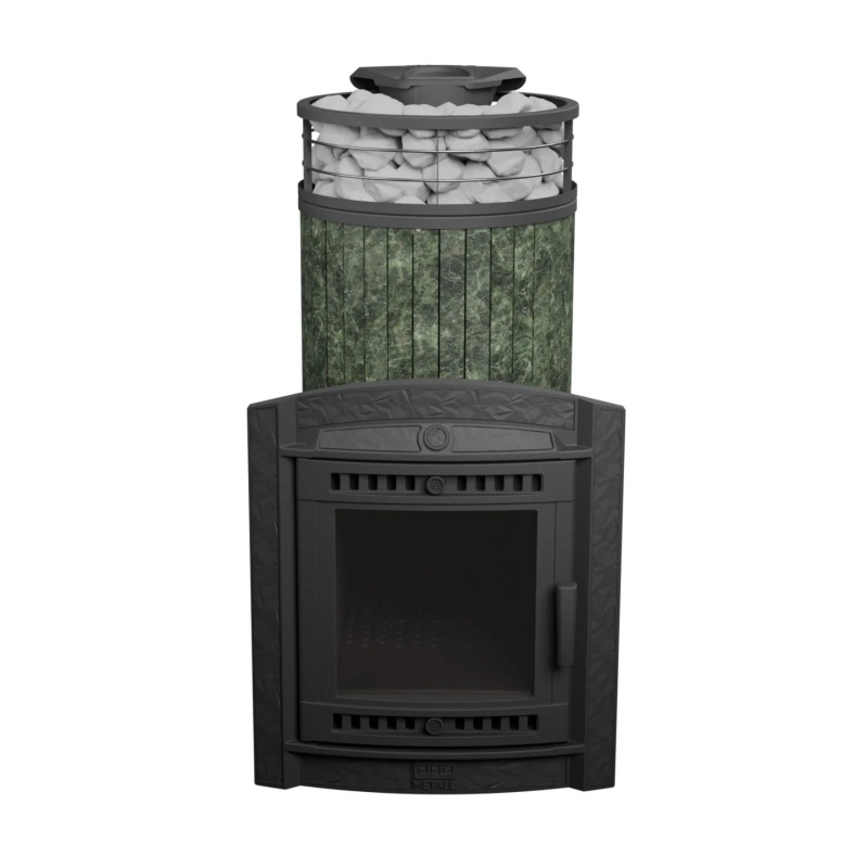 Теплоаккумуляция и эстетика: ламели из змеевика обладают высокой способностью аккумулировать тепло, а зелёная текстура змеевика придаёт печи натуральный и премиальный внешний вид.
