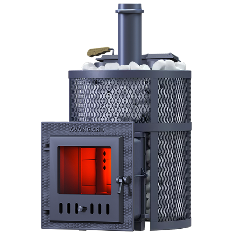 Масса пароиспарителя в печи AVANGARD 51 кг, и он нагревается прямым контактом с пламенем. У пароиспарителя 2 поверхности с увеличенной рабочей площадью – снизу идёт нагрев огнём, а сверху поддаётся вода для пара. У печи уникальная, массивная каменка с теплонакопительными воронками, для получения легкого пара.
