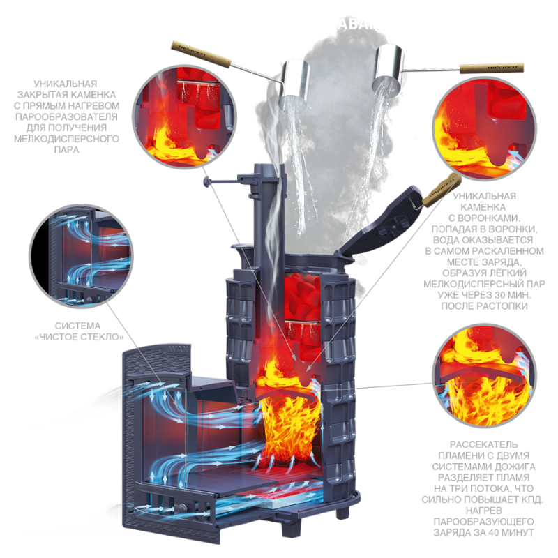 Под каменкой на 3-х упорах установлен рассекатель пламени, он разделяет пламя на 3 потока и направляет сначала на боковые части корпуса для интенсивного нагрева стенок и конвекционного нагрева воздуха в парной. Для этого на наружных поверхностях расположены конвекционные рёбра. Дальше пламя проходит через выступы к выходу в дымоход, нагревая каменку. Каменка позволяет устанавливать различные стартовые модули вместе с шиберным блоком.