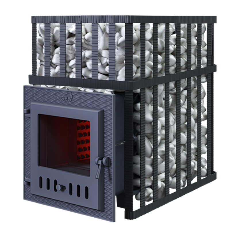Печь для бани Технолит GFS ЗК 25 в сетке — печь с усиленной каменкой большей массы, с единым углублением внутрь топки для дополнительной укладки чугунного заряда. Теплосъемные шипы, со стороны горения пламени, в разы увеличивают площадь соприкосновения огня с каменкой и ускоряют передачу тепла, а также способствуют лучшему дожигу смешивая потоки пламени и воздуха поступаемого из воздушника. Эти усовершенствования значительно повышают мощность парообразования печи и выдают большее количество пара при непрерывной подаче воды. Каменка печей GFS-ЗК является незаливаемой.