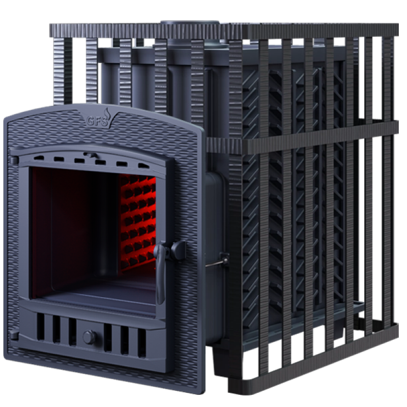 Печь для бани Технолит GFS ЗК 25 в сетке — банная печь с усиленной каменкой большей массы, с единым углублением внутрь топки для дополнительной укладки чугунного заряда. Теплосъемные шипы, со стороны горения пламени, в разы увеличивают площадь соприкосновения огня с каменкой и ускоряют передачу тепла, а также способствуют лучшему дожигу смешивая потоки пламени и воздуха поступаемого из воздушника. Эти усовершенствования значительно повышают мощность парообразования печи и выдают большее количество пара при непрерывной подаче воды. Каменка печей GFS-ЗК является незаливаемой.