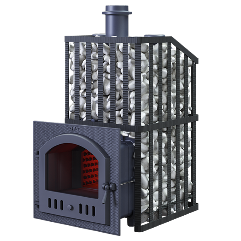 Печь для бани Технолит GFS ЗК 40 (М) Ураган — расширенный комплект печи GFS-ЗК в сетке. Максимально приближенный вариант печи для режимов русской парной, имеющий непосредственно закрытую чугунным коробом каменку, дверцу для пара с ручкой из бука, увеличенную до 50см чугунную стартовую трубу. Печь легко модернизируется до полноценной печи предназначенной для Русской бани путем замены стальной сетки на каменную облицовку без демонтажа дымохода.