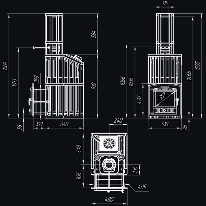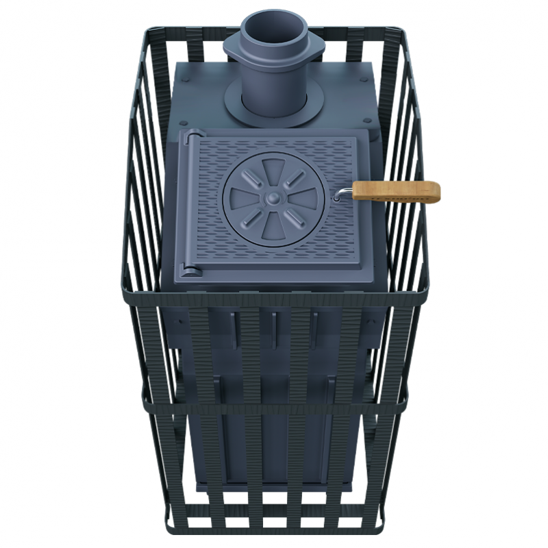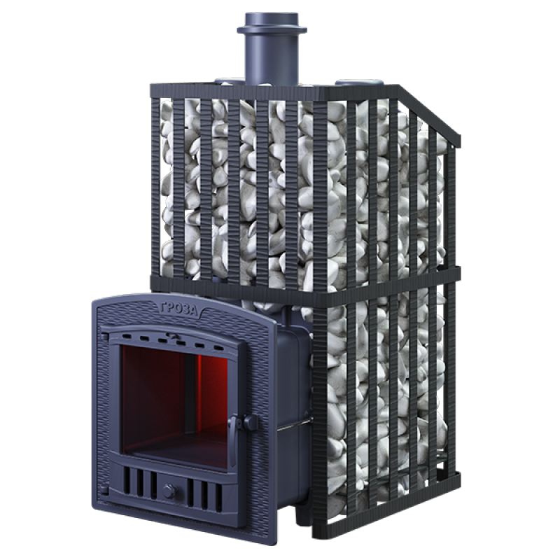 Печь для бани Технолит Гроза 24 (П2) Ураган — расширенный комплект печи в сетке. Максимально приближенный вариант печи для режимов русской парной, имеющий непосредственно закрытую чугунным коробом каменку, дверцу для пара с ручкой из бука, увеличенную до 50 см чугунную стартовую трубу. Печь легко модернизируется до полноценной печи предназначенной для Русской бани путем замены стальной сетки на каменную облицовку без демонтажа дымохода.