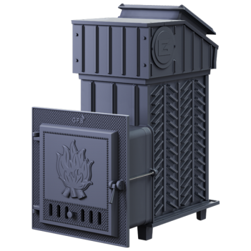 Печь для бани Технолит GFS ЗК 25 Универсальный печь-комплект — печь с усиленной каменкой большей массы, с единым углублением внутрь топки для дополнительной укладки чугунного заряда. Теплосъемные шипы, со стороны горения пламени, в разы увеличивают площадь соприкосновения огня с каменкой и ускоряют передачу тепла, а также способствуют лучшему дожигу смешивая потоки пламени и воздуха поступаемого из воздушника. Эти усовершенствования значительно повышают мощность парообразования печи и выдают большее количество пара при непрерывной подаче воды. Каменка печей GFS-ЗК является незаливаемой.
