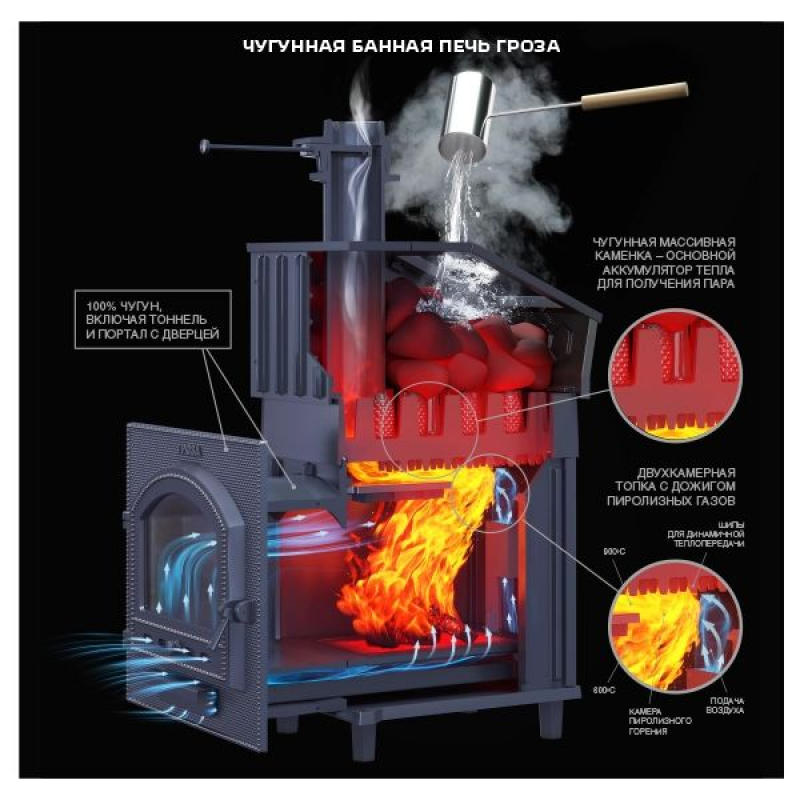 Печь для бани Технолит Гроза 18 (М) Универсальный печь-комплект — это современные печи, рассчитанные на малые и средние размеры парных. Печь имеет прочную сборную конструкцию, без резьбовых и сварных соединений, детали выполнены из легированного чугуна. Топка печей «Гроза» состоит из двух камер, разделенных пламегасителем. Радиаторные выступы каменки, направленные вглубь топки, увеличивают площадь контакта огня с каменкой и эффективность теплосъема. Для увеличения площади поверхности нагрева камней каменка снаружи оборудована чугунными шипами, направленными вверх. Между шипами укладываются банные камни или дополнительные чугунные заклады, такие как ядра и чугунные шишки. Сами чугунные шипы также являются частью заряда для лучшего испарения воды.