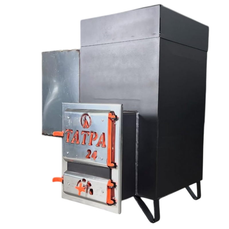 Дровяная печь Татра Т24 предназначена для непрерывного обогрева банного помещения или сауны объемом около 26 кубометров. Печь изготовлена из котловой стали марки 09Г2С с толщиной стенок 8 миллиметров и состоит из двух частей - топки и каменки.