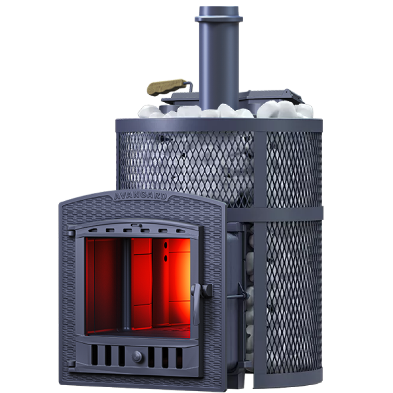 Масса пароиспарителя в печи AVANGARD 75 кг, и он нагревается прямым контактом с пламенем. У пароиспарителя 2 поверхности с увеличенной рабочей площадью – снизу идёт нагрев огнём, а сверху поддаётся вода для пара. У печи уникальная, массивная каменка с теплонакопительными воронками, для получения легкого пара.