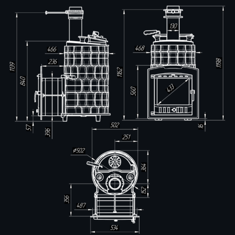 Под каменкой на 3-х упорах установлен рассекатель пламени, он разделяет пламя на 3 потока и направляет сначала на боковые части корпуса для интенсивного нагрева стенок и конвекционного нагрева воздуха в парной. Для этого на наружных поверхностях расположены конвекционные рёбра. Дальше пламя проходит через выступы к выходу в дымоход, нагревая каменку. Каменка позволяет устанавливать различные стартовые модули вместе с шиберным блоком.