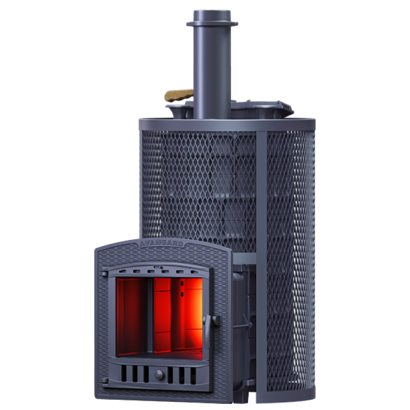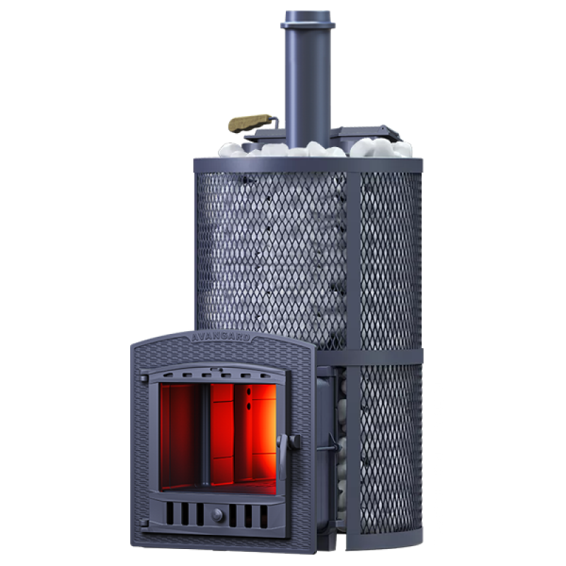 Масса пароиспарителя в печи AVANGARD 75 кг, и он нагревается прямым контактом с пламенем. У пароиспарителя 2 поверхности с увеличенной рабочей площадью – снизу идёт нагрев огнём, а сверху поддаётся вода для пара. У печи уникальная, массивная каменка с теплонакопительными воронками, для получения легкого пара.