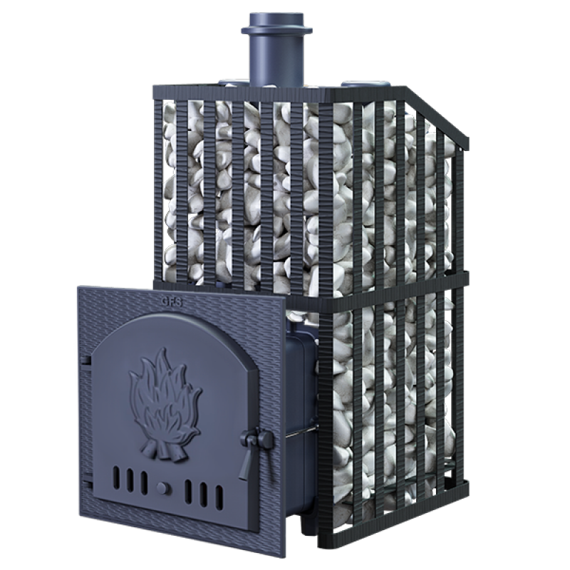 Печь для бани Технолит GFS ЗК 40 Ураган — расширенный комплект печи GFS-ЗК в сетке. Максимально приближенный вариант печи для режимов русской парной, имеющий непосредственно закрытую чугунным коробом каменку, дверцу для пара с ручкой из бука, увеличенную до 50см чугунную стартовую трубу. Печь легко модернизируется до полноценной печи предназначенной для Русской бани путем замены стальной сетки на каменную облицовку без демонтажа дымохода.