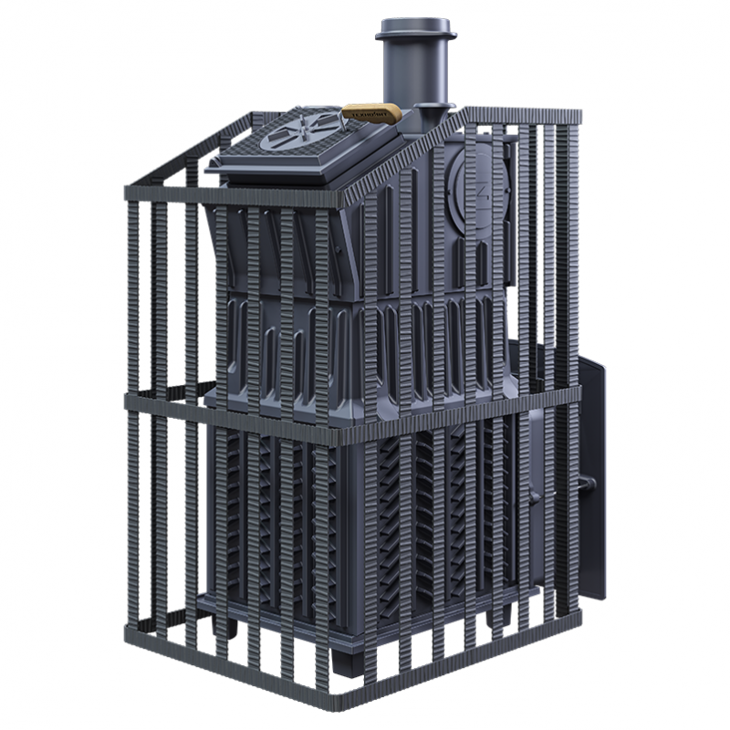 Печь легко модернизируется до полноценной печи предназначенной для Русской бани путем замены стальной сетки на каменную облицовку без демонтажа дымохода.