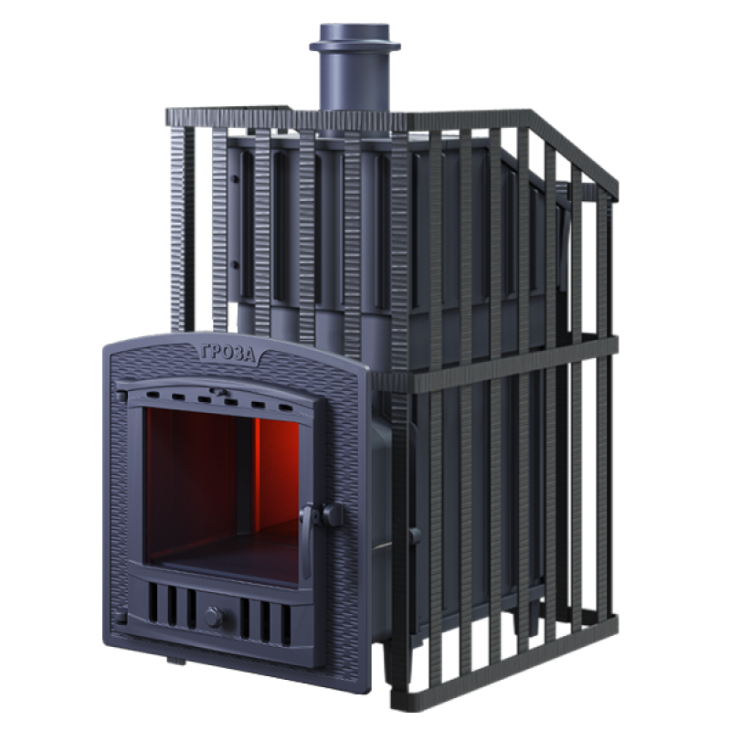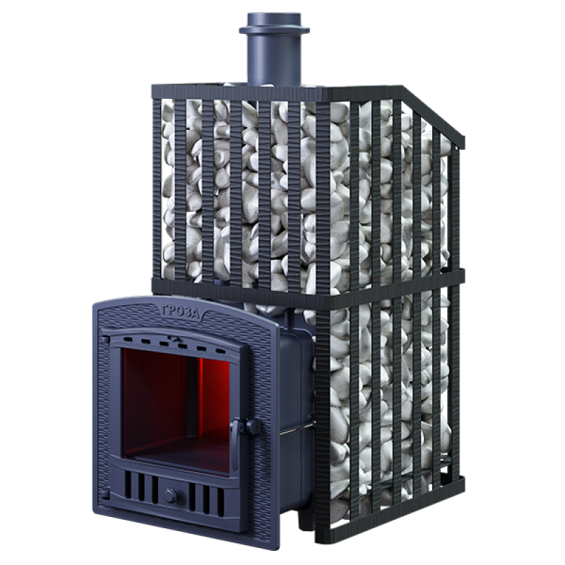Печь для бани Технолит Гроза 18 (П2) Ураган — расширенный комплект печи в сетке. Максимально приближенный вариант печи для режимов русской парной, имеющий непосредственно закрытую чугунным коробом каменку, дверцу для пара с ручкой из бука, увеличенную до 50 см чугунную стартовую трубу. Печь легко модернизируется до полноценной печи предназначенной для Русской бани путем замены стальной сетки на каменную облицовку без демонтажа дымохода.