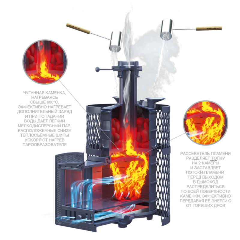 Рассекатель пламени разделяет топку на 2 камеры и заставляет потоки пламени перед выходом в дымоход распределиться по всей поверхности каменки эффективно передавая её энергию от горящих дров.