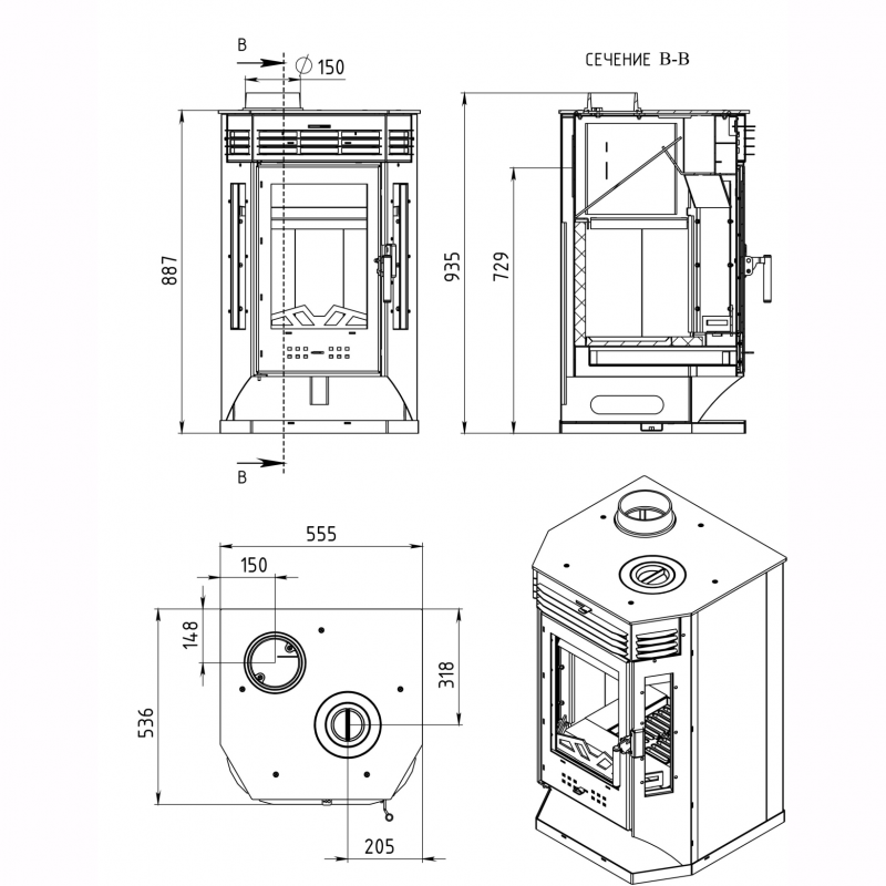 Гибкость подключения дымохода Возможность вывода дымохода сверху или сзади делает модель удобной для разных планировок помещения и упрощает монтаж. Заглушка на крышке позволяет при заднем подключении использовать крышку как дополнительную конфорку.