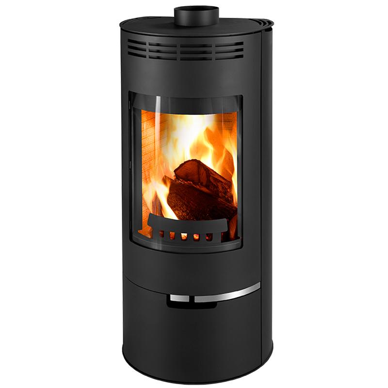 Печь-камин Thorma Andorra черная — стильная цилиндрическая печь, обладающая закругленным стеклом. Выглядит она современно, а через стекло, расположенное в дверце, удобно любоваться языками пламени и присматривать за огнем. Стекло является огнеупорным, оно прекрасно выдерживает температуру до 750°C. Но если вы случайно ударите по нему кочергой, могут появиться трещины. Так как стекло панорамное, площадь обзора становится больше на 20%. За счет этого огонь выглядит объемнее.