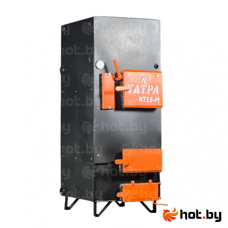 Котел Татра КТ15-НП1 работает на твердом топливе и представляет собой гибрид пиролизного котла и котла горизонтального горения (шахтного типа). Длительность горения на одной закладке топлива составляет 12 и более часов. При условии номинальных нагрузок: отапливаемое помещение до 120 м2 и утепление дома согласно климатической зоны, например для РБ 30см газосиликат + 10см минвата.
