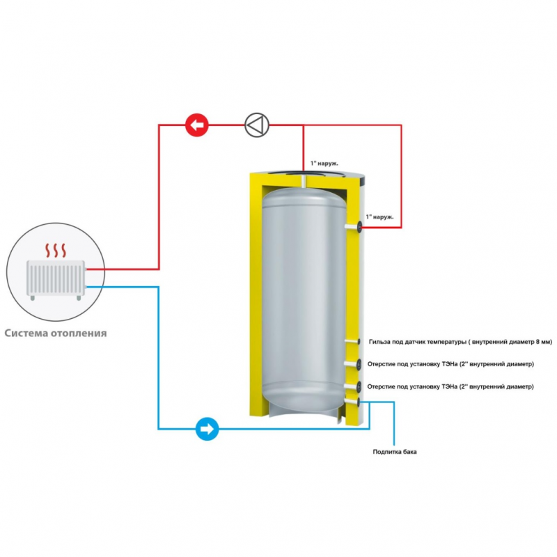 Бак предназначен для аккумулирования тепла от электротэнов, которые размещаются в отверстия диаметром 2″ внутренняя резьба. Стандартное количество отверстий – 2 шт. Опционально можно разместить до 10 шт. На внешней стороне бака расположены шпильки для крепления шкафа управления электрическими ТЭНами.